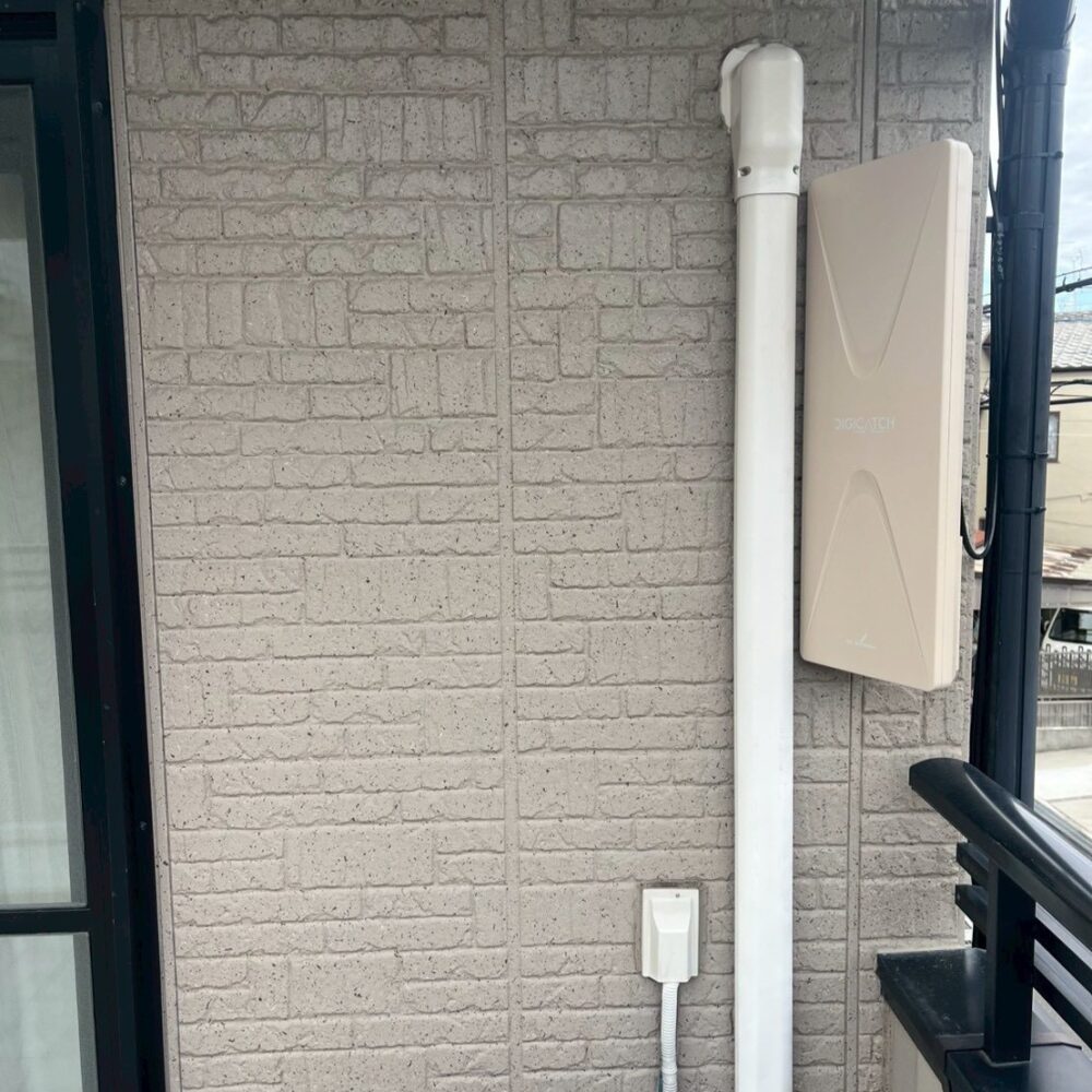 突出し金具を使用し、ユニコーンアンテナを設置しています。シンプルなポール状が特徴の本アンテナは、八木式やデザインアンテナと同じUHFアンテナの一つです。住宅のデザインを損なわず、スリムな形状で住宅密集地にも最適、設置スペースが小さく済むため狭い場所にも対応しています。