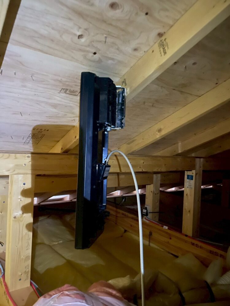 デザインアンテナを屋根裏に設置した様子です。屋根裏に設置することで雨風をしのぎ経年劣化を最小限に抑えることができます。メンテナンスが少なく済むと話題で、人気の設置方法です。通常の設置より難しい作業になることが多いですが、地デジやドットコムでは全スタッフ施工可能。ご希望の方はご相談ください。