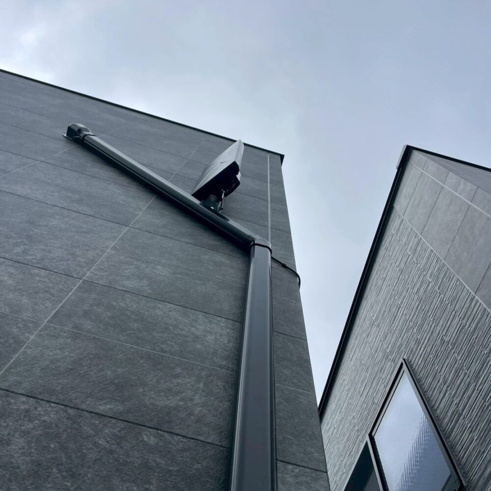 デザインアンテナと4K8KBSCSアンテナを外壁に設置しています。こちらは同じ場所に設置していますが、BSアンテナは南西方向に向けて設置するため、ご自宅の電波状況によっては離れた場所に設置することもあります。